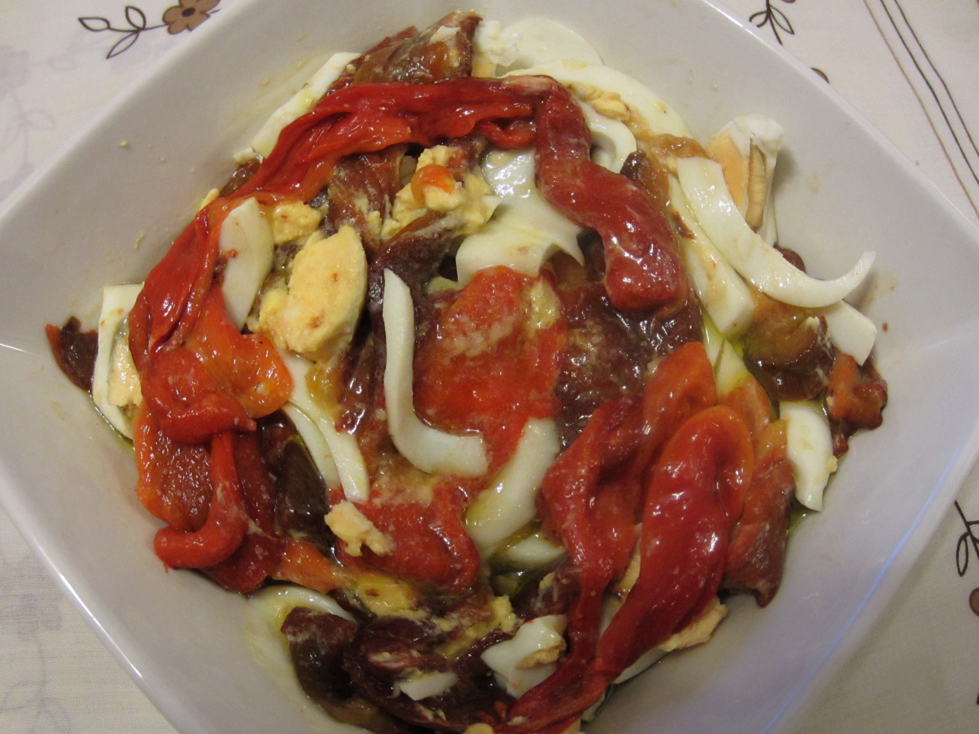4. Colocar en una fuente las tiras de pimiento y los huevos duros.