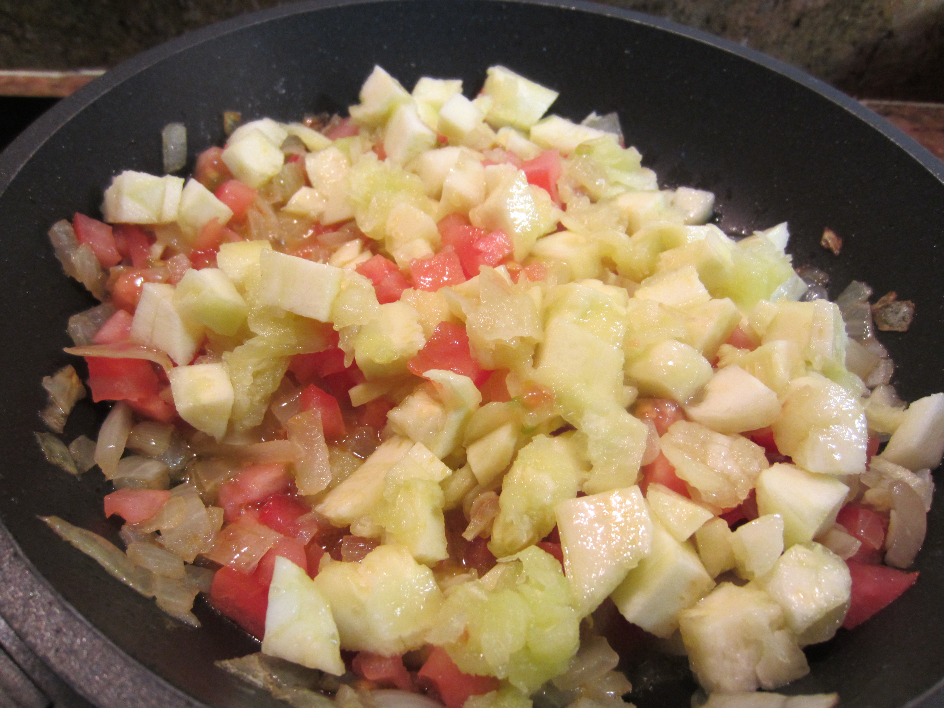 - Picar la cebolla, el ajo y los tomates, y mezclar con la pulpa del calabacín; rehogar en una sartén con una cucharada de aceite.
