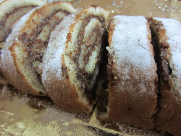 - Humedecer toda la superficie del bizcocho con el almíbar ( se puede usar un bote de spray , reservado solo para este uso); extender la crema, volver a enrollar y espolvorear con azúcar glass.