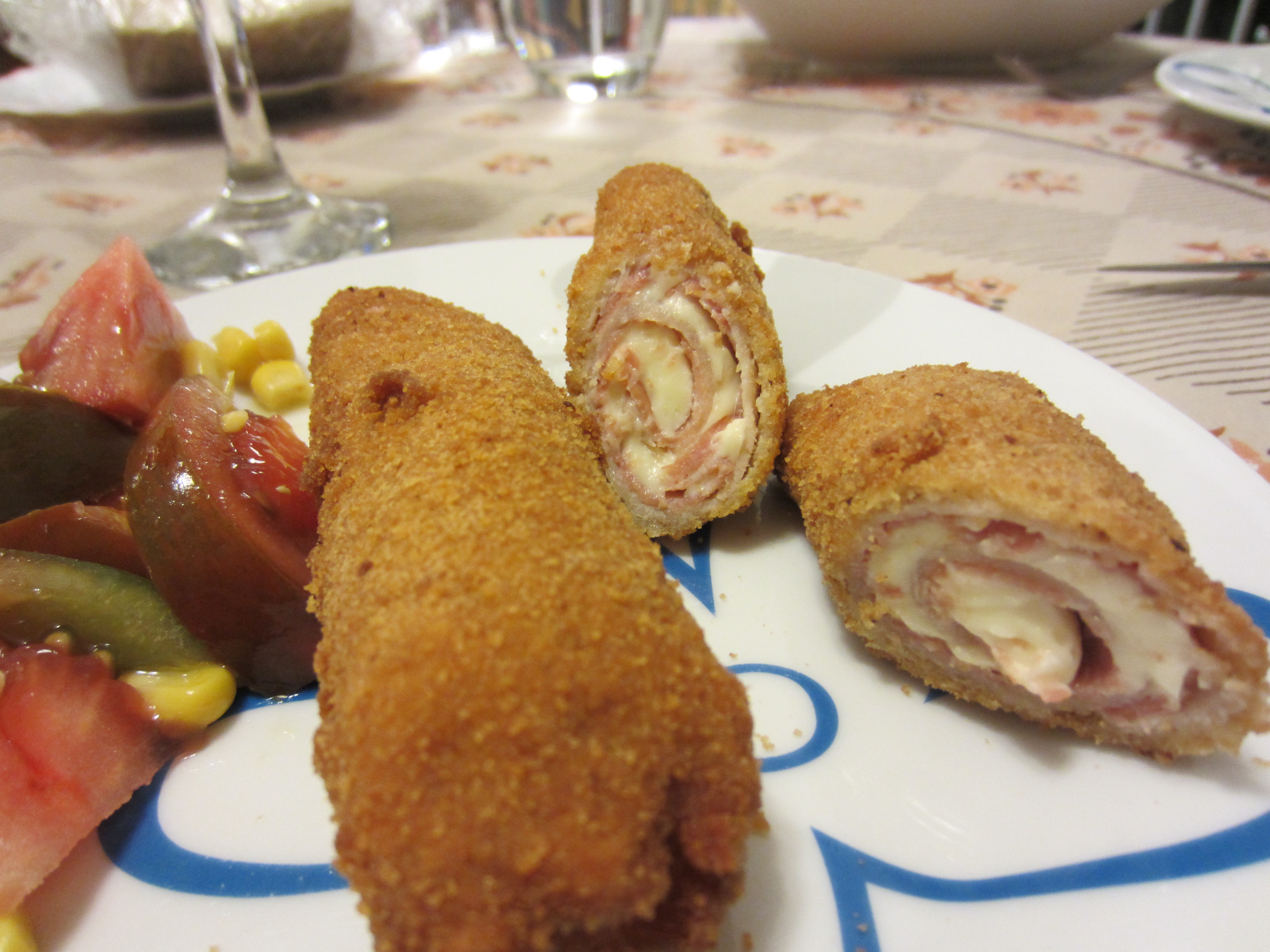 - Sobre la los filetes de lomo colocar una loncha de jamón y sobre esta una de queso; enrollar y pasar por huevo batido y pan rallado.