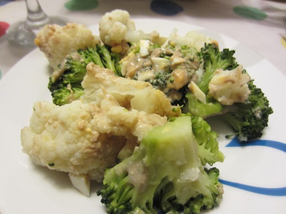 - En una ensaladera poner el brocoli y la coliflor; aliñar con la mezcla y añadir la cebolleta.