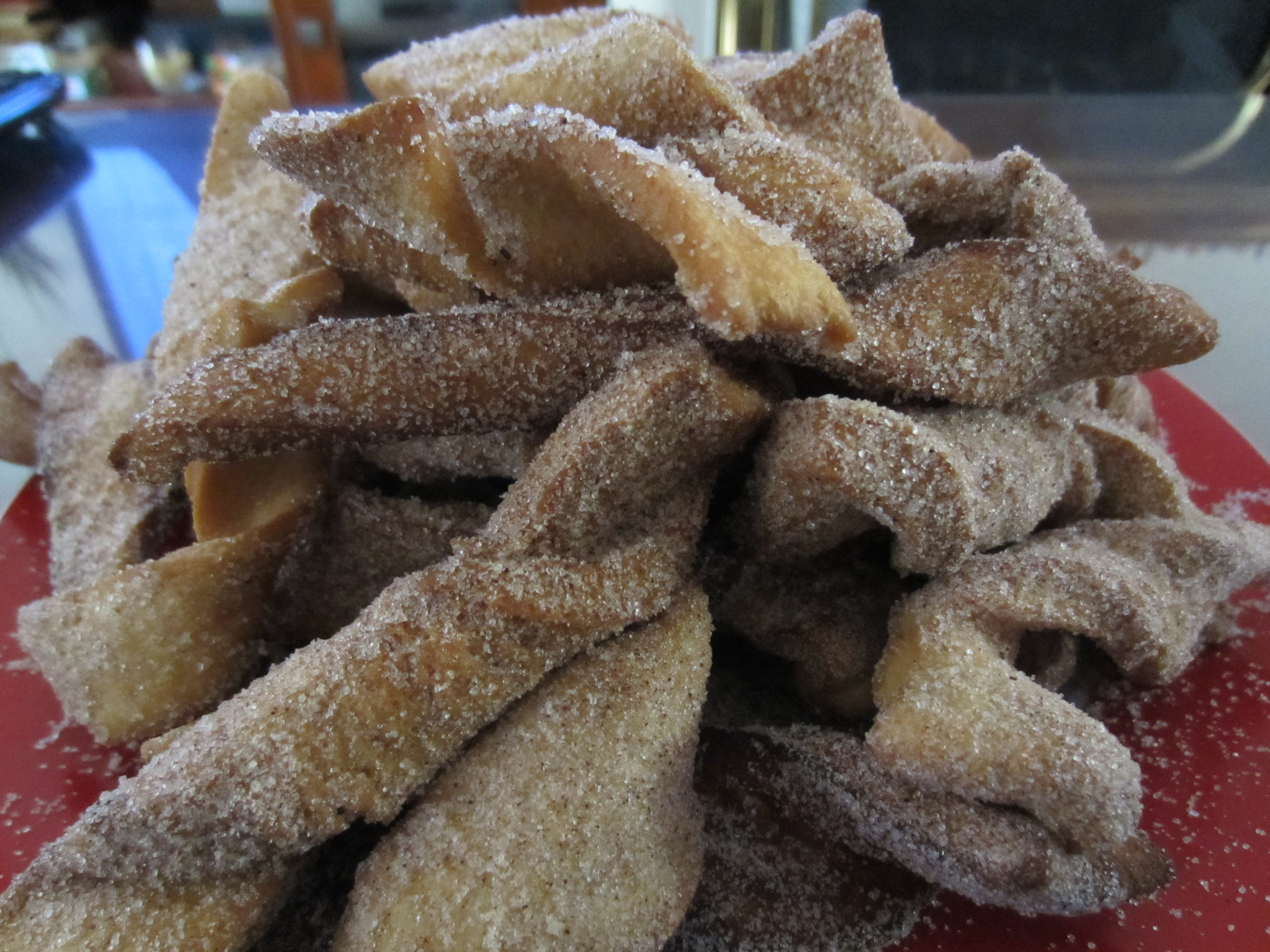 - Freir las tiras de masa en aceite caliente, dándoles un «retorcido» antes de dejarlas caer en el aceite para que adquieran forma irregular.