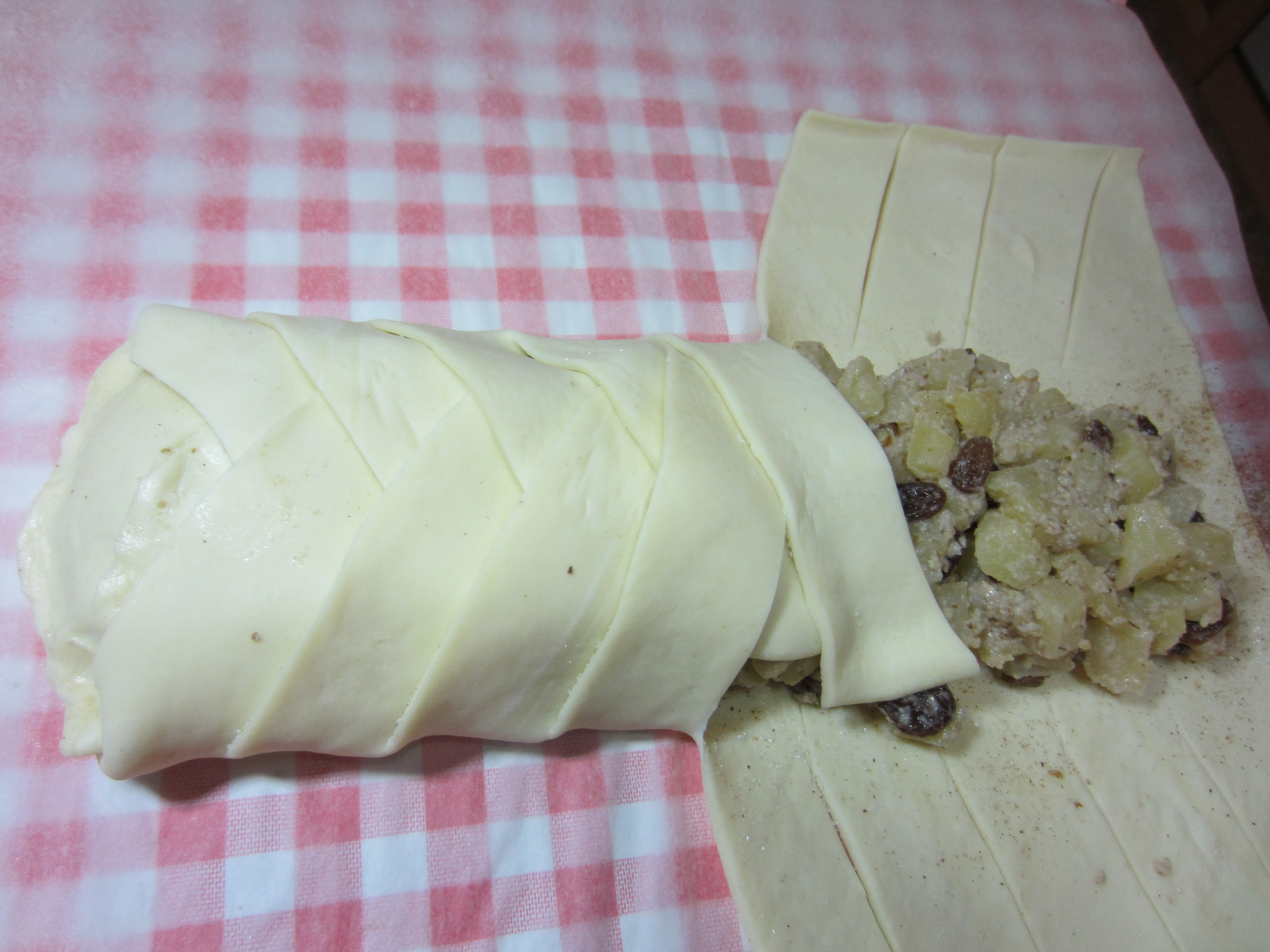 - Formar la trenza entrelazando las tiras cortadas, alternando una de la derecha y una de la izquierda, por encima del relleno y así sucesivamente, hasta llegar al final.