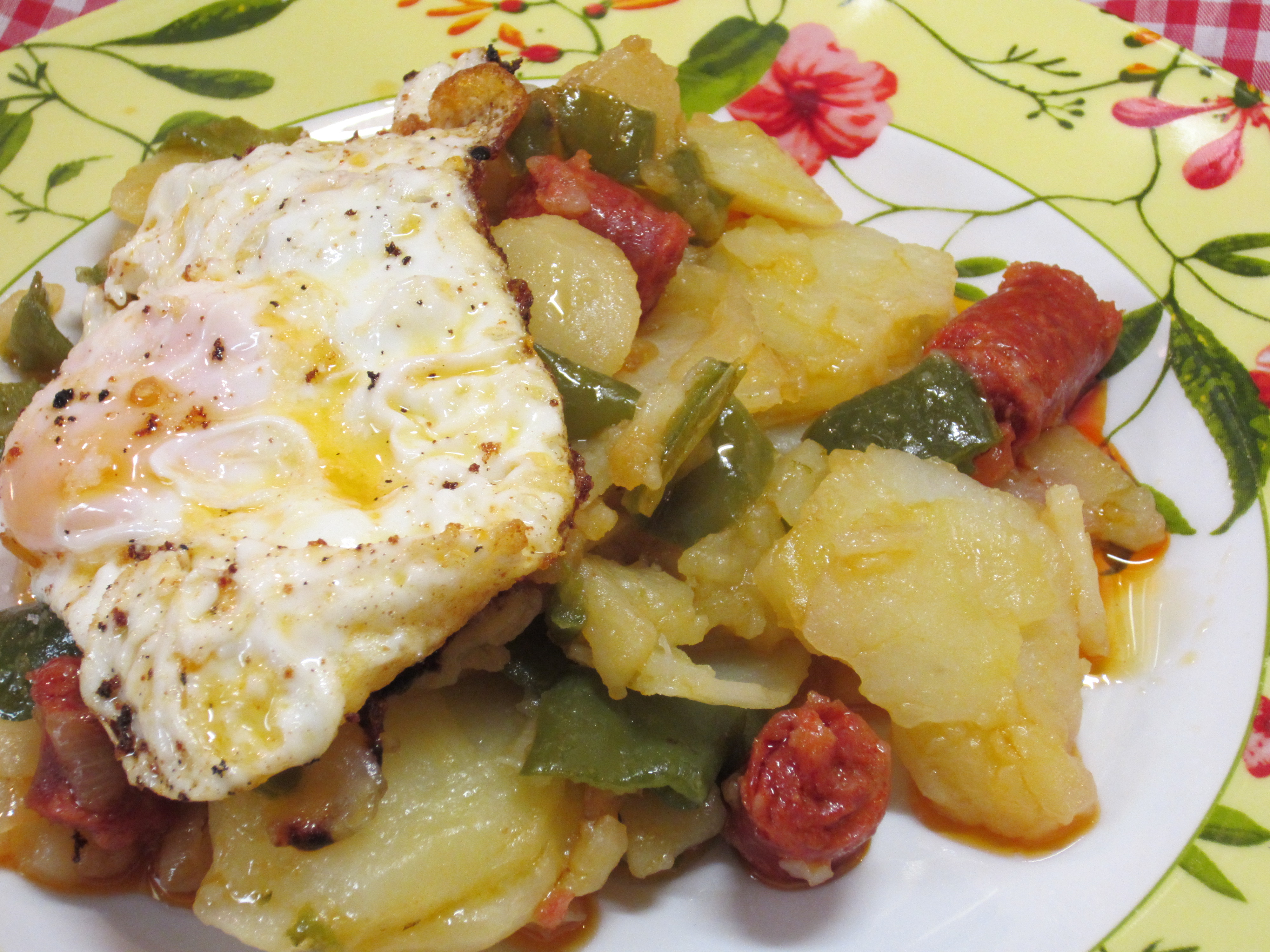 - Cuando las patatas estén casi en su punto retirar la tapadera y añadir la chistorra troceada y dejar sofreir mezclandola con el resto.