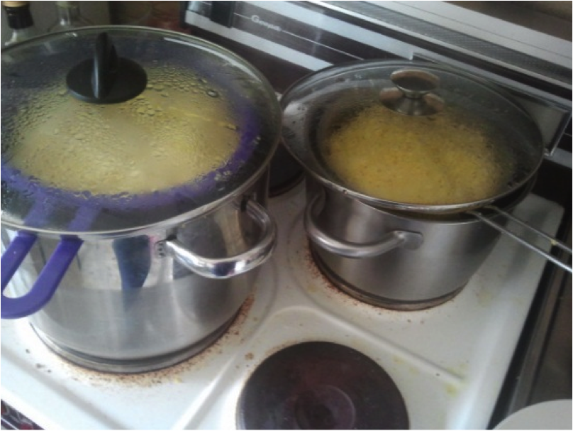 - Luego sacamos un vaso de caldo de la olla. Le añadimos una cucharada de mantequilla y lo removemos para que se disuelva bien.