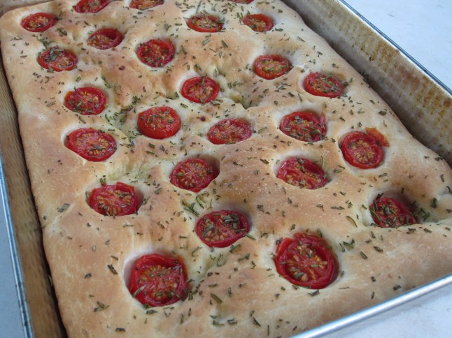 - Repartir los tomates sobre la focaccia y presionarlos hasta el fondo.