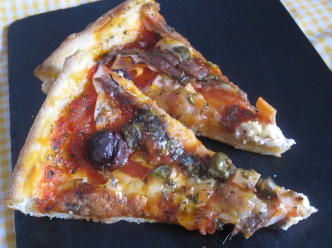 - Repartir las anchoas, las alcaparras, las aceitunas y alcachofas de lata (en mitades y escurridas) sobre la pizza; espolvorear con queso rallado mozzarella y hornear a 220ºC durante 12-15 minutos