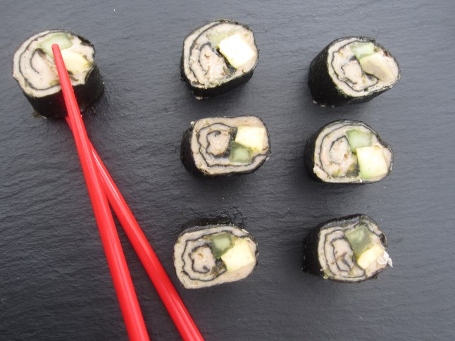 4. Poner a  lo transversal, el pepino y el aguacate  sobre centro de la pasta de judías; con ayuda de la esterilla ir enrollando el alga nori dando forma de cilindro.