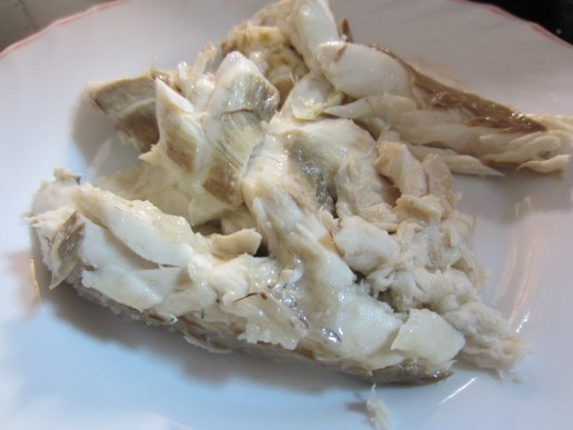 - Sacar la bandeja del horno y retirar la costra de sal; limpiar la lubina retirando la cabeza y la piel y sacar las mollas del pescado.