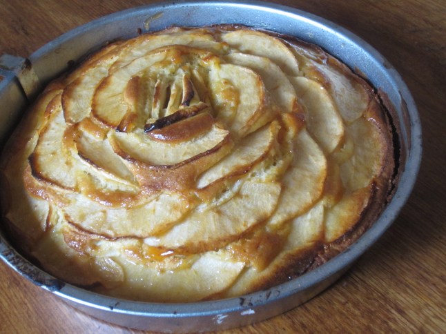 - Engrasar con mantequilla un molde para tarta y verter en el la mezcla; distribuir por encima las lonchas de manzana, superponiéndolas unas en otras.