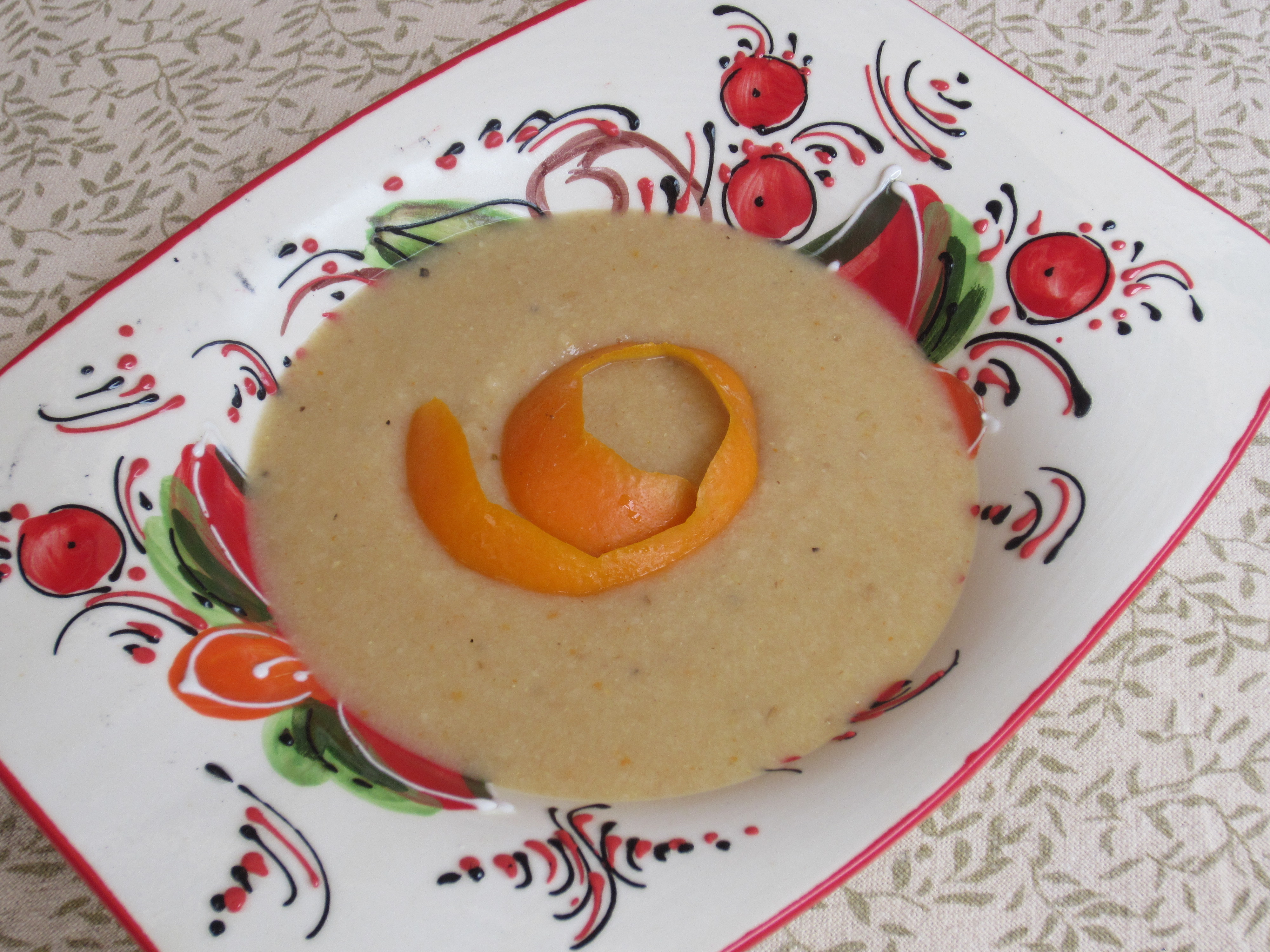 6. Añadir poco a poca el agua de hervir la cascara de la naranja, la cantidad dependerá de consistencia que se desee dar a la sopa y pasar la preparación a una olla.