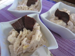 - Pelar los plátanos, retirar las hebrillas y triturar con la batidora ( o machacar en un plato ); agregarlos al bol y mezclar.