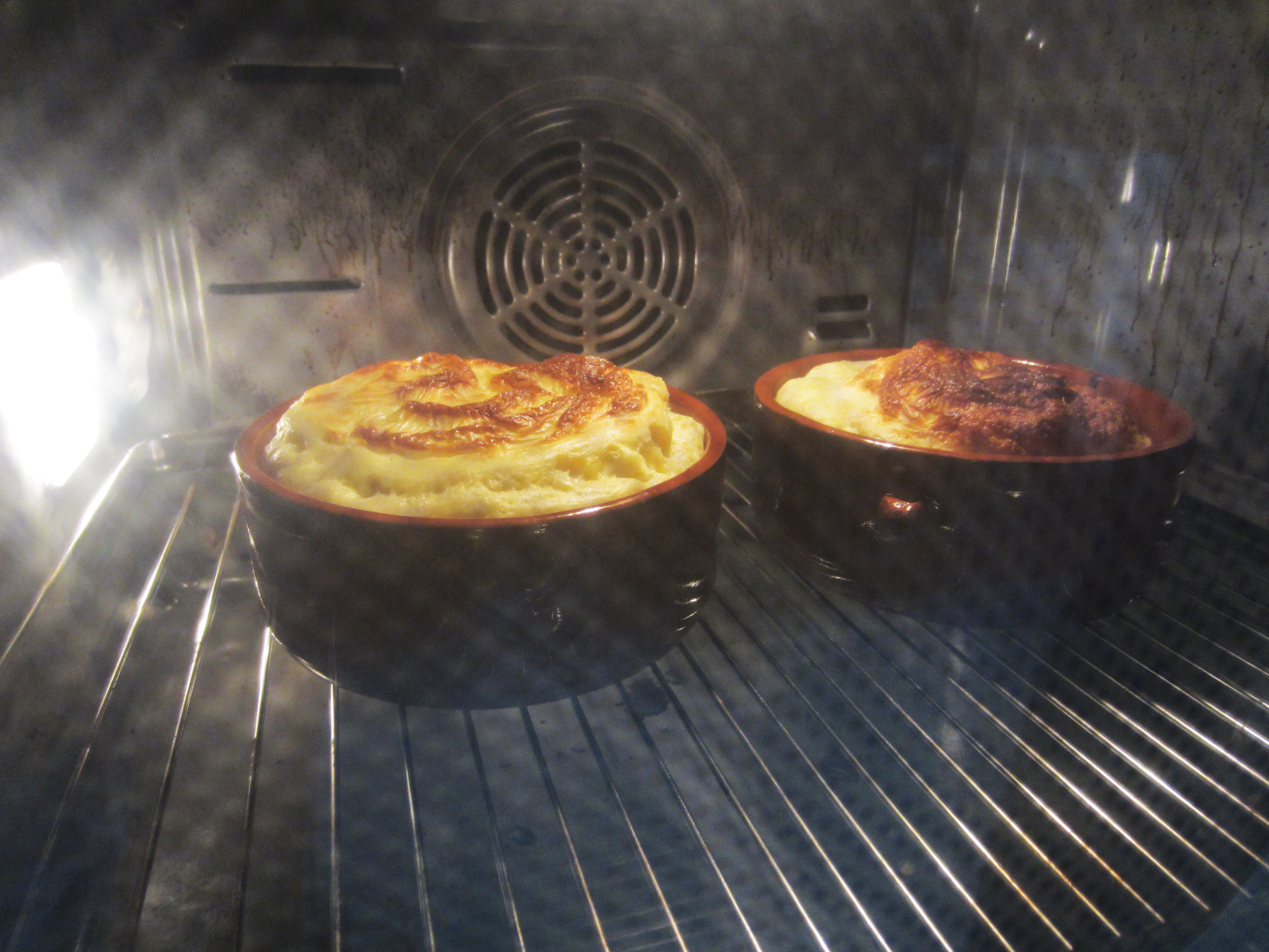 5. Espolvorear el gruyer sobre los moldes engrasados con mantequilla, rellenarlo con la masa y hornearlo durante 25 minutos. EVITE ABRIR LA PUERTA DEL HORNO DURANTE LA COCCIÓN, así no se de desinflará el soufflé.
