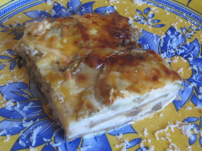 3. En un cuenco batir el huevo con la nata y salpimentar; verter esto sobre la fuente y cubrir con queso rallado. Hornear a 180º durante 45 minutos.
