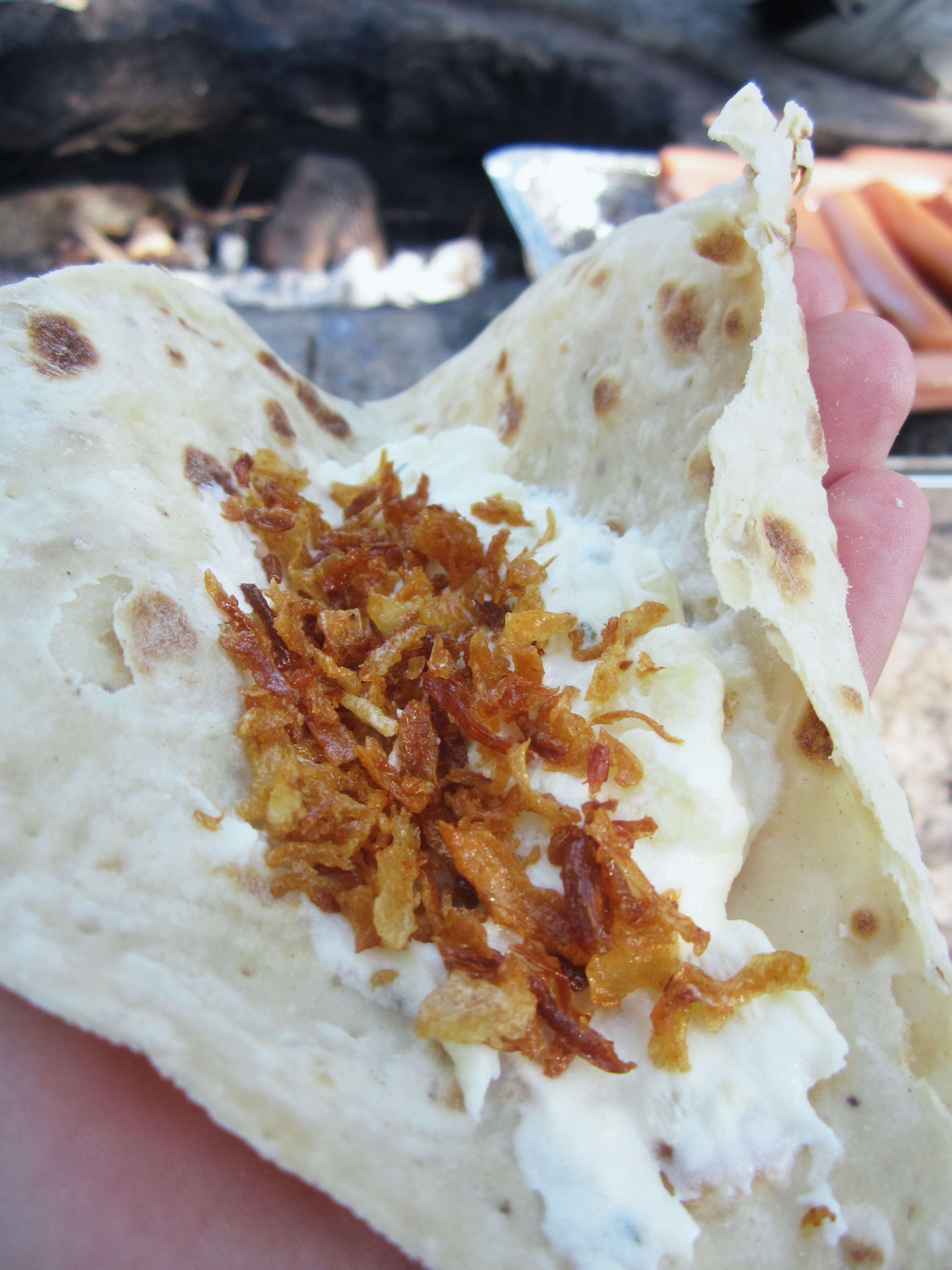 En primer lugar colocar sobre la tortita una base de potato salad, continuar con la cebolla caramelizada y una loncha de queso, una vez que tenemos esto podemos añadir la salchicha y ketchup & mayonesa & mostaza al gusto y enrollar.